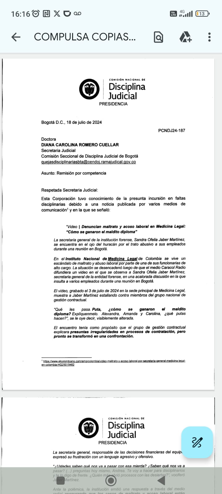 La compulsa se debe al episodio ocurrido el 3 de julio en una sala del sexto piso de Medicina Legal, cuando la hoy exsecretaria general de Medicina Legal, Sandra Ofelia Jaber Martínez, estalló en ira contra sus subalternas.