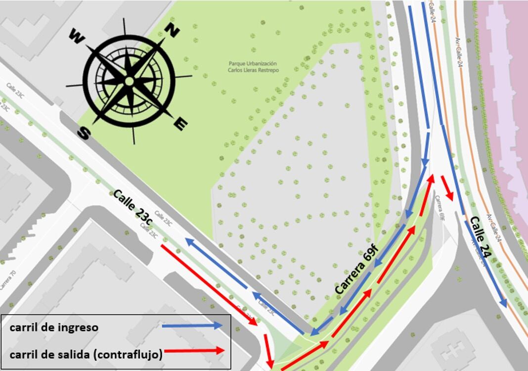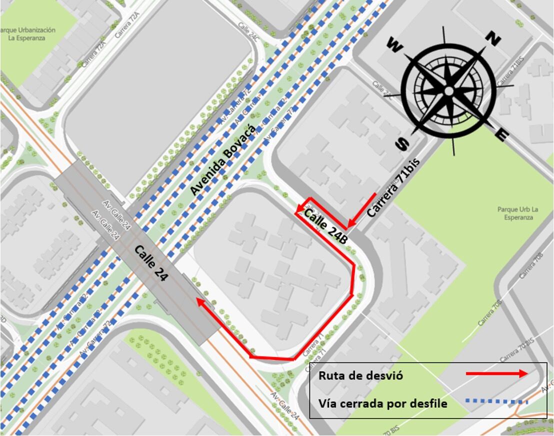 - Las personas que se encuentren en el lado noroeste de la avenida Boyacá, entre las calles 24C y 24, deberán circular temporalmente en sentido contrario por la carrera 72A para conectar con la avenida Calle 24 y continuar hacia el oeste. Como lo muestra la imagen: