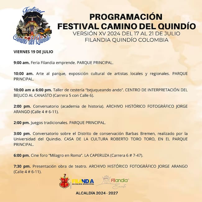 Programación Festival Camino del Quindío 2024, viernes 19 de julio: Foto Cortesía alcaldía de Filandia