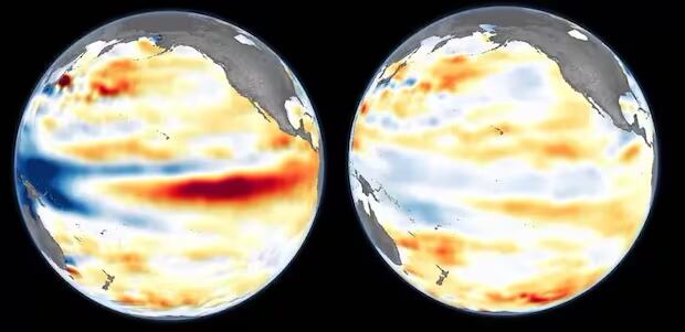 Comparación de los anomalías en el centro y este del océano Pacífico, reveladas el 4 de diciembre de 2023 (izquierda) y el 1 de julio de 2024 (derecha)/ NASA