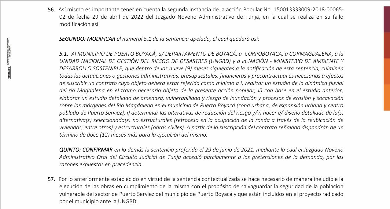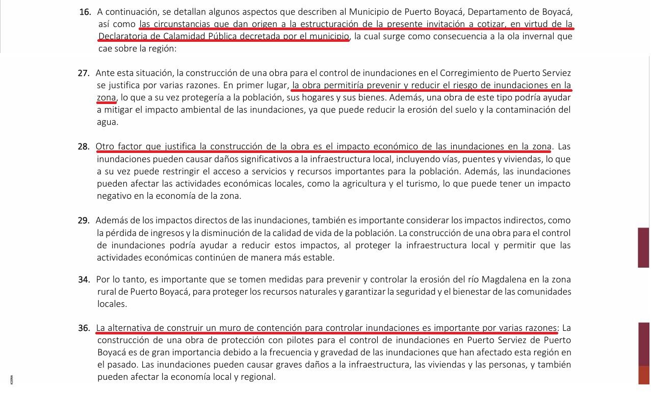 Y más adelante, se exponen las razones por las cuales se hizo esta invitación a cotizar, dentro de las que figuran el hecho de que el Municipio haya declarado calamidad pública en julio del 2023, lo cual no concuerda con la verdadera razón que es el cumplimiento de una sentencia judicial del Tribunal Administrativo de Boyacá, a raíz de la acción que interpuso la Fundación Casa Blanca, para que se construyera un muro que mitigue el impacto de las inundaciones del río Magdalena en el corregimiento de Puerto Serviez. Aquí algunos de los argumentos que hay en la parte del Considerando: