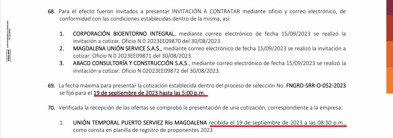 El 15 de septiembre del 2023 la Fiduprevisora envió la invitación a cotizar, mediante oficio y correo electrónico, a Corporación Bioentorno Integral, Magdalena Union Service S.A.S. y Abaco Consultoría y Construcción S.A.S, fijando como fecha máxima el envío de los documentos, el 19 de septiembre del 2023 a las 5 p.m. Cuatro días después, solo Magdalena Union Service S.A.S envió lo solicitado, eso sí por fuera del plazo del horario establecido, porque ingresó a las 8:50 p.m., casi cuatro horas después de la hora que había fijado la Fiduprevisora.