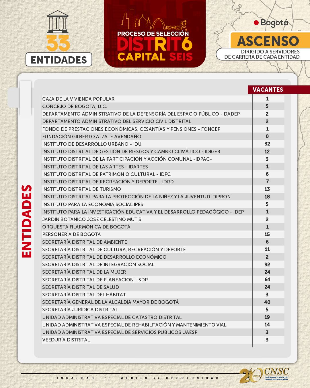 Desde el pasado 19 de julio, la Comisión Nacional del Servicio Civil CNSC oficializó la etapa de inscripciones para la modalidad ascenso del proceso Distrito Capital 6. Para esta primera etapa, la entidad ofertará 437 vacantes en 33 entidades públicas como el Concejo de Bogotá, institutos, secretarías y la Veeduría Distrital, entre otros.