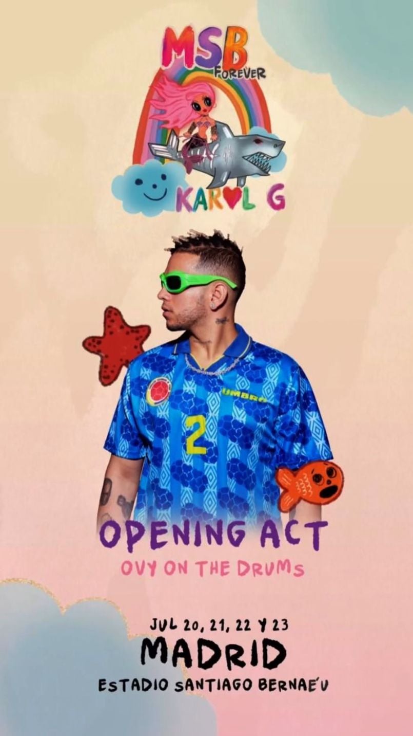 Ovy On The Drums, reconocido productor y artista urbano colombiano, fue el encargado de dar inicio a las cuatro fechas consecutivas de conciertos con entradas agotadas de Karol G en el icónico Estadio Santiago Bernabéu en Madrid, España.