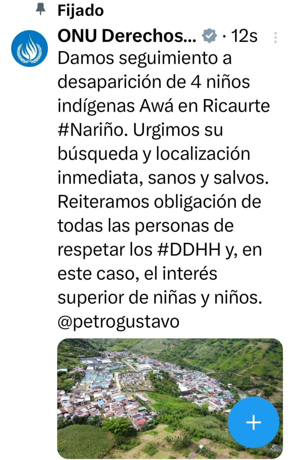 Cuatro menores de edad pertenecientes a la comunidad indígena AWA se encuentran desaparecidos. El caso se conoció a través de la alerta de la Organización de las Naciones Unidas para los Derechos Humanos, la cual hizo un llamado para que se inicie de inmediato su búsqueda y se logre su ubicación sanos y salvos.