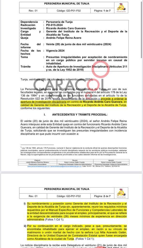 Así mismo la Personera Delegada para la Vigilancia Administrativa de Tunja, confirmó la apertura de una investigación disciplinaria en contra de Ricardo Andrés Caro Guevara, en calidad de Gerente del Instituto de la Recreación y el Deporte de la Alcaldía de Tunja”, teniendo en cuenta que, el 20 de junio de dos 2024, el señor Andrés Felipe Reina Acero interpuso ante esta Entidad queja en contra del funcionario Ricardo Andrés Caro Guevara, en calidad de Gerente del Irdet, solicitando que se investiguen las presuntas irregularidades con incidencia disciplinaria en que pudo incurrir ya que su nombramiento y posesión como Gerente del Instituto de la Recreación y el Deporte de la Alcaldía de Tunja sin, aparentemente, reunir los requisitos mínimos requeridos por el Manual Específico de Funciones y Competencias Laborales de la entidad descentralizada para ocupar el empleo, principalmente, el que se refiere a la exigencia de 26 meses mínimos de experiencia en dirección administrativa”.