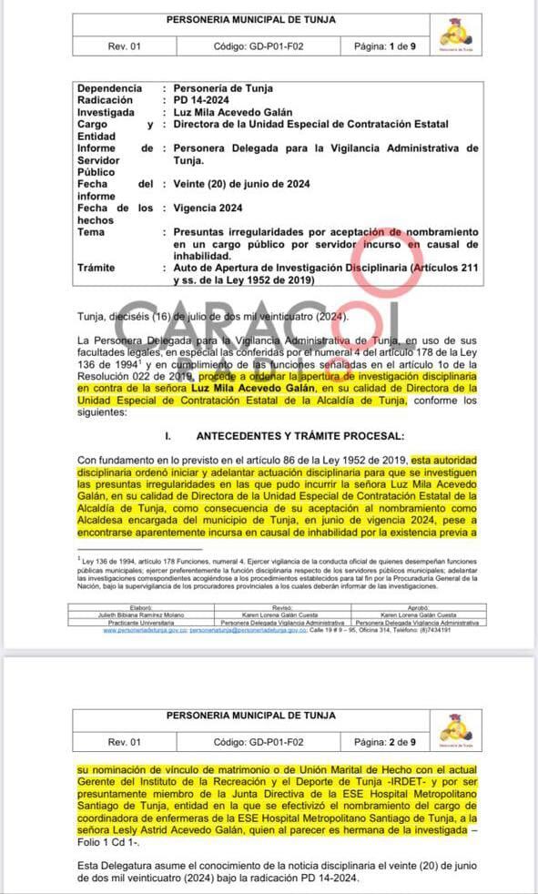 Caracol Radio conoció que la Personera Delegada para la Vigilancia Administrativa de Tunja, ordenó la apertura de investigación disciplinaria en contra de Luz Mila Acevedo Galán, en su calidad de Directora de la Unidad Especial de Contratación Estatal de la Alcaldía de Tunja, “por presuntas irregularidades en las que pudo incurrir como consecuencia de su aceptación al nombramiento como Alcaldesa encargada del municipio de Tunja, en junio de 2024, pese a encontrarse aparentemente incursa en causal de inhabilidad por la existencia previa a su nominación de vínculo de matrimonio o de Unión Marital de Hecho con el actual Gerente del Instituto de la Recreación y el Deporte de Tunja -IRDET- y por ser presuntamente integrante de la Junta Directiva de la ESE Hospital Metropolitano Santiago de Tunja, entidad en la que se hizo el nombramiento del cargo de coordinadora de enfermeras de Lesly Astrid Acevedo Galán, quien al parecer es su hermana”.