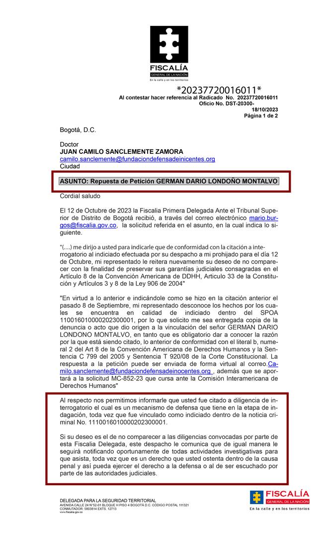 “Al respecto nos permitimos informarle que usted fue citado a diligencia de interrogatorio el cual es un mecanismo de defensa que tiene en la etapa de indagación, toda vez que fue vinculado como indiciado dentro de la noticia criminal No. 1110016010000202300001. Si su deseo es el de no comparecer a las diligencias convocadas por parte de esta Fiscalia Delegada, este despacho le comunica que de igual manera le seguirá notificando oportunamente de todas actividades investigativas para que asista” ((ver documento))