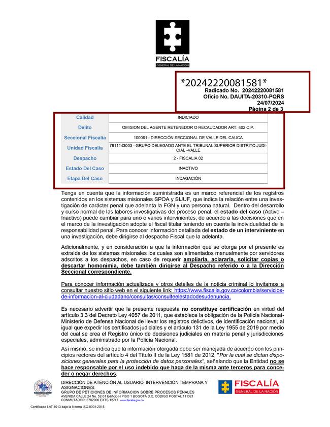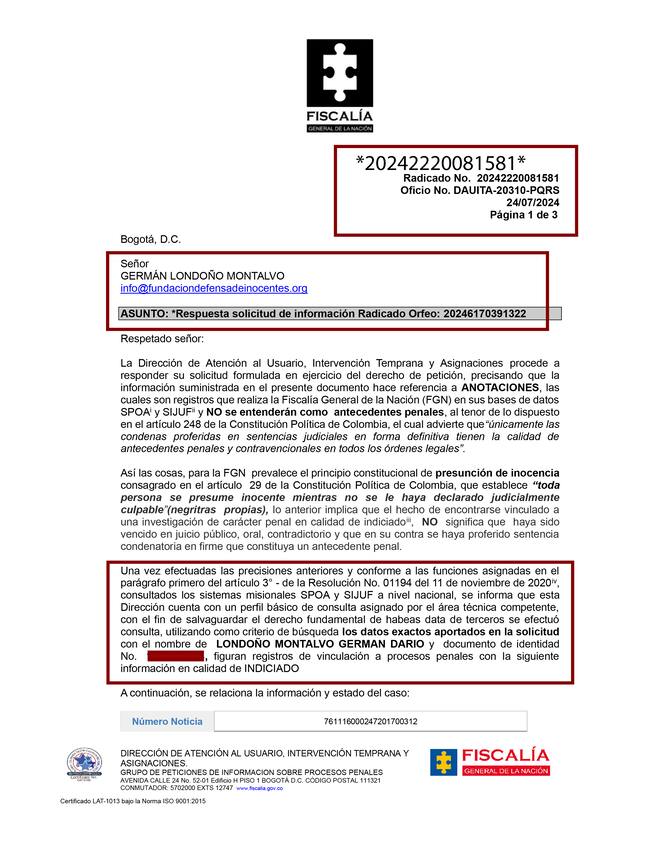 Pero otra cosa dice el documento de la Fiscalía que tiene como fecha de expedición 24 de julio de 2024 y que está firmado por María Mercedes Ariza, directora de Atención al Usuario, Intervención Temprana y Asignaciones.