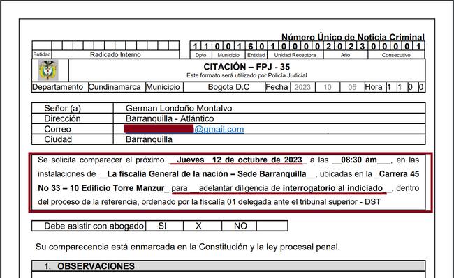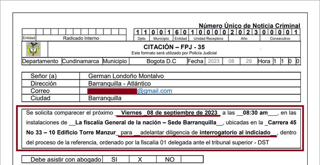 Pese a no tener un proceso abierto en su contra, el fiscal Burgos, cuando estaba al frente del caso Nicolás, citó a Germán Londoño a interrogatorio de indiciado en dos ocasiones.