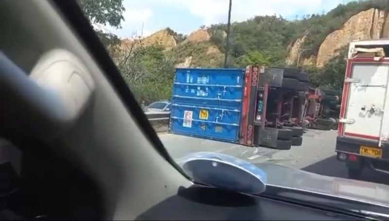 Por fallo en los frenos un tractocamión se volcó bajando del aeropuerto Palonegro