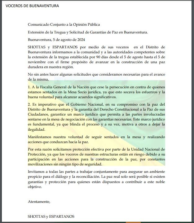 A través de un comunicado las bandas armadas ilegales de Shottas y Espartanos, del puerto de Buenaventura, que extendieron la tregua de Paz, solicitaron que cese la persecución en contra de los integrantes sentados en la Mesa Socio Jurídica que adelantan desde hace un año con el gobierno del presidente Gustavo Petro.