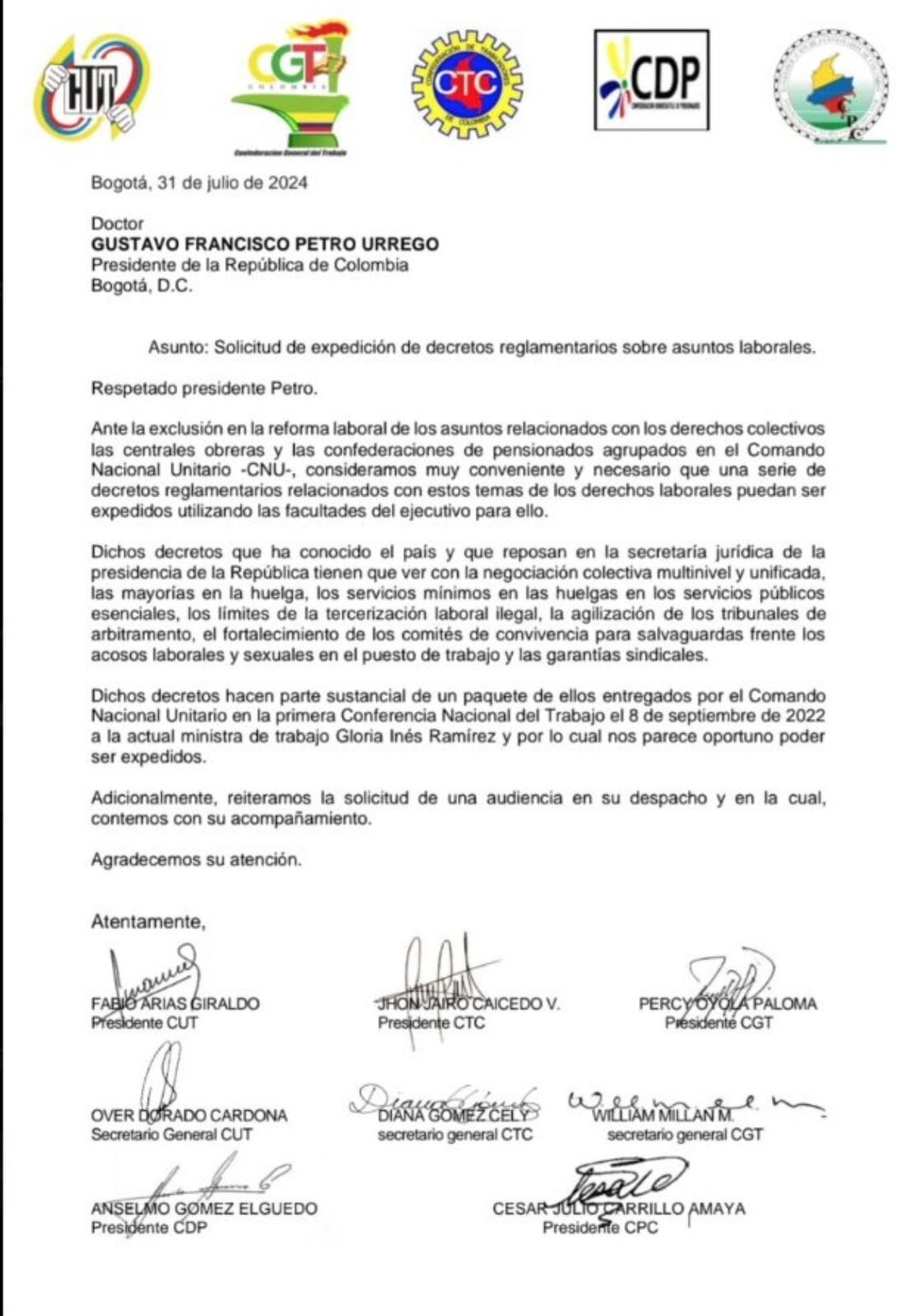 El Comando Nacional Unitario integrado por la Central Unitaria de Trabajadores de Colombia (CUT), la Confederación General del Trabajo (CGT), Confederación de Trabajadores de Colombia (CTC), entre otros sindicatos, le enviaron una carta al presidente Gustavo Petro en la que le pidieron que considerara expedir decretos sobre los derechos colectivos de las centrales obreras y de las confederaciones de pensionados.