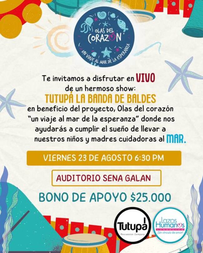 Ha sido muy lindo ver el proceso y ver las personas como han apoyado este sueño, personas que se han vinculado y dentro de ellos TUTUPA, La Banda de los Baldes, qué es un show de percusión experimental, Felipe nos dijo queremos donar un concierto para que recauden fondos, entonces es lo que va a pasar el 23 de agosto es un show muy lindo de percusión experimental, donde tienen coreografía musical donde las personas interactúan con la banda, Va a ser a las 6:30 pm en el auditorio del Sena Galán y bueno todas las familias están súper invitadas porque es un espacio precisamente para eso para compartir en familia y obviamente para aportar a esta a esta causa y este sueño tan lindo.