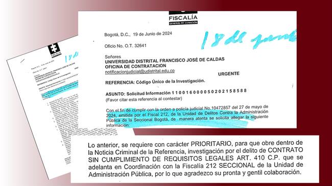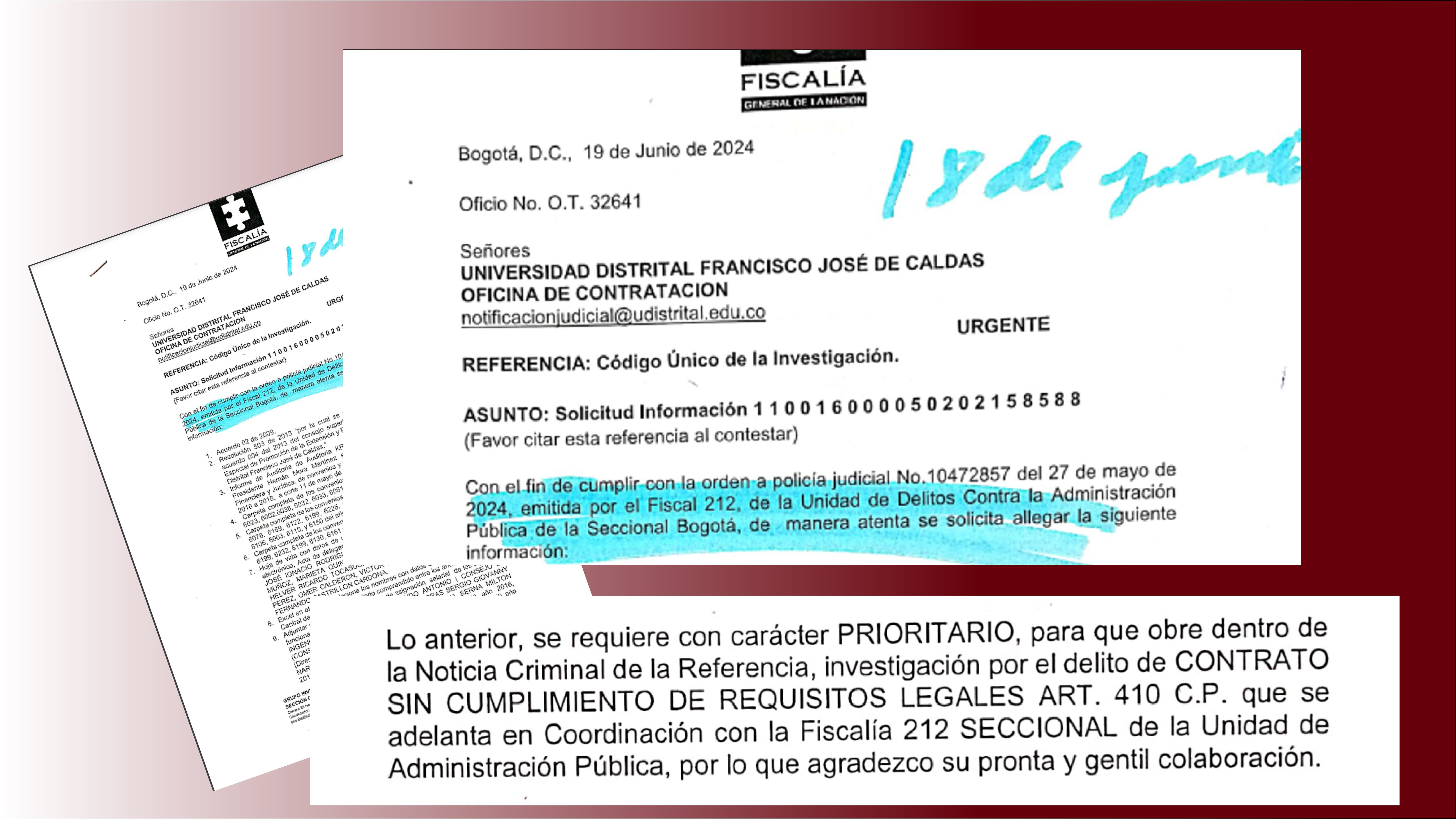 En el caso de la Fiscalía, un oficio con fecha del 19 de junio de 2024 firmado por el investigador del Grupo Investigativo de Delitos contra la Administración Pública de la seccional Bogotá da cuenta que el ente acusador indaga por presunta corrupción en contratación.