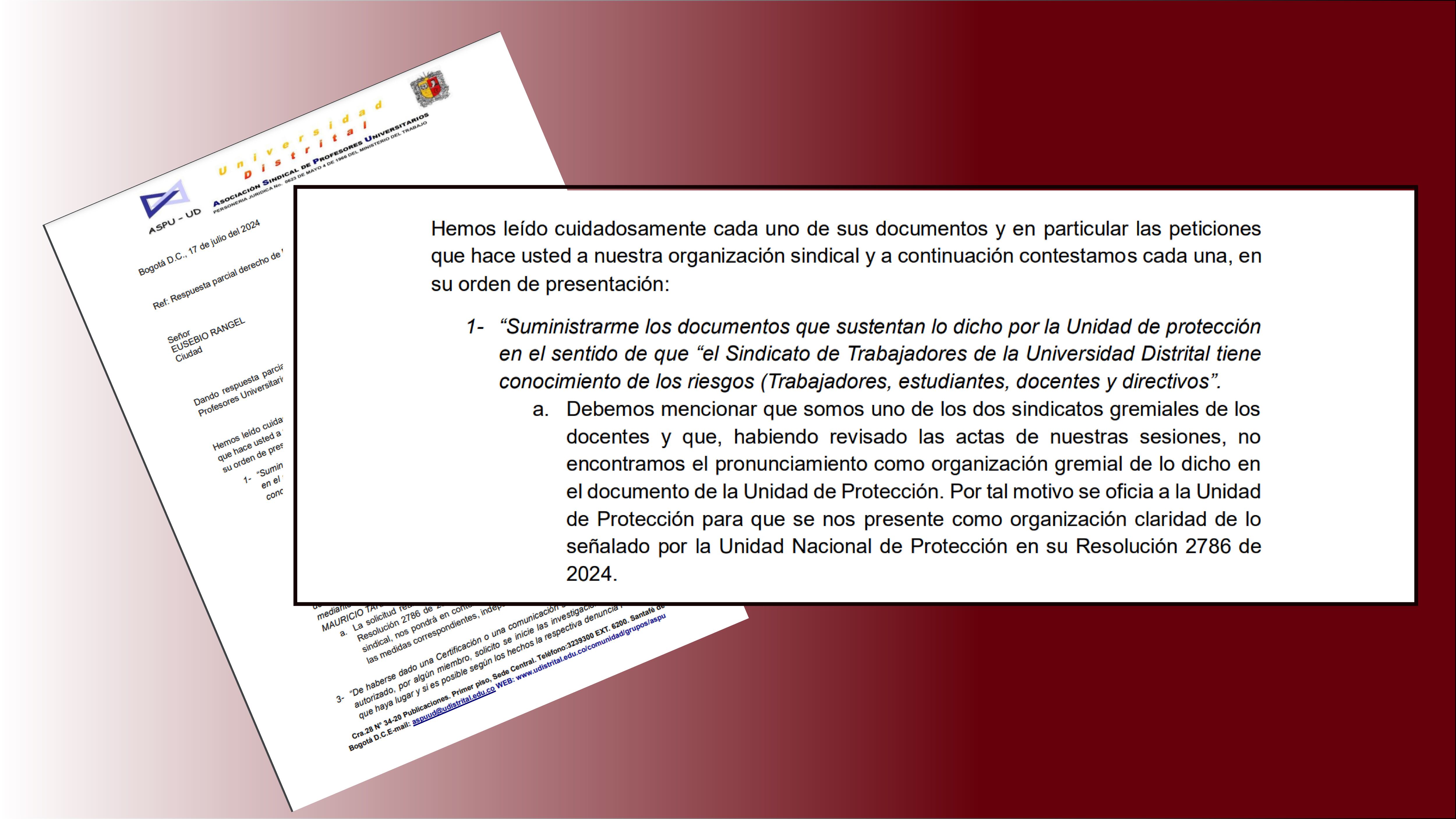La resolución también se basa en una certificación de la Asociación Sindical de Profesores Universitarios, que avala las amenazas, pero esa agremiación, en un oficio diferente, advirtió a la UNP que nunca ha expedido tal pronunciamiento. (ver documento)