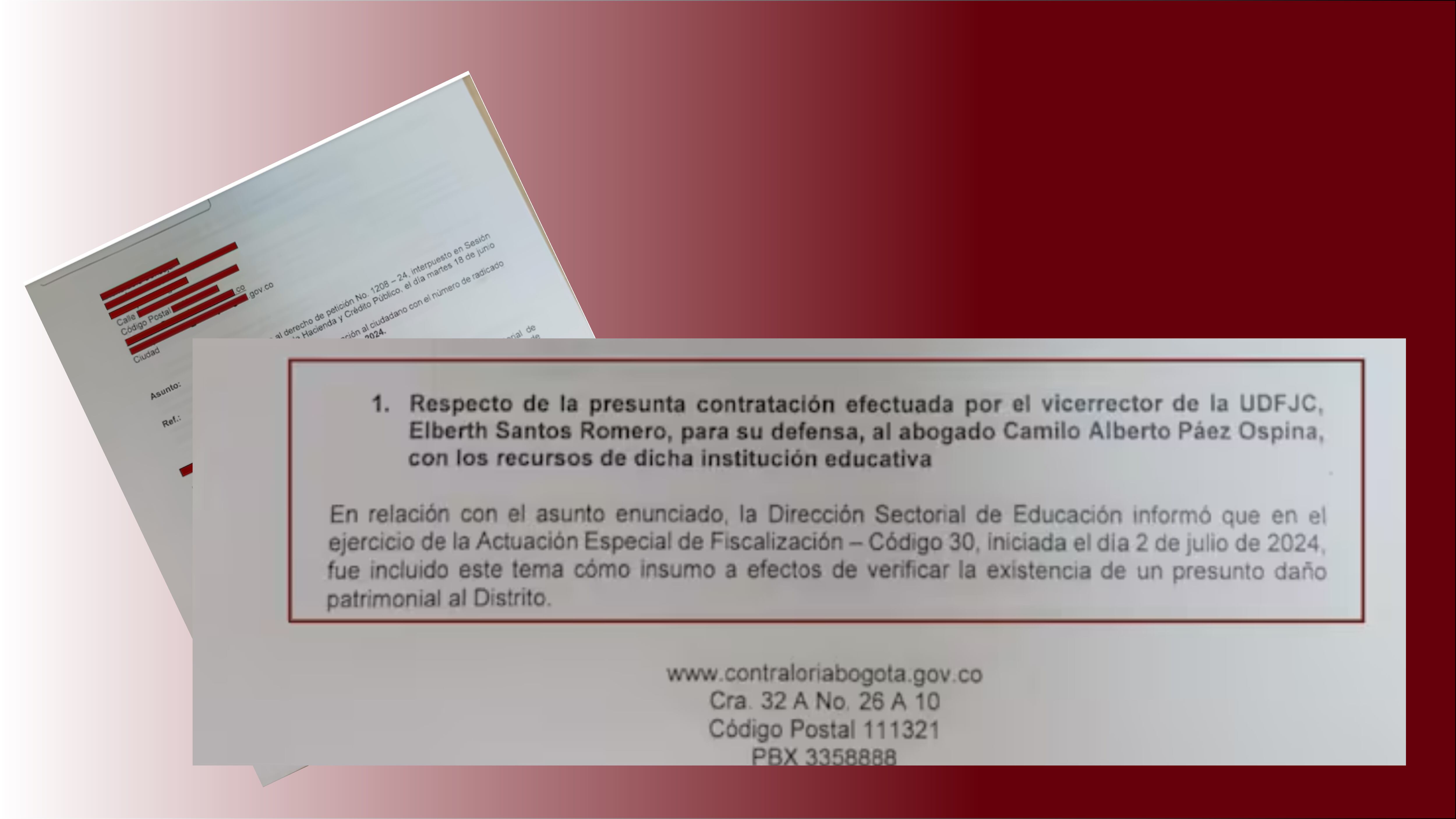 Y en la Contraloría de Bogotá se indaga por la presunta contratación irregular que involucra al vicerrector de la Universidad Distrital, Elberth Santos Romero por la contratación de un abogado para que asuma la defensa de sus asuntos personales, pero, pagado con recursos de la Universidad.