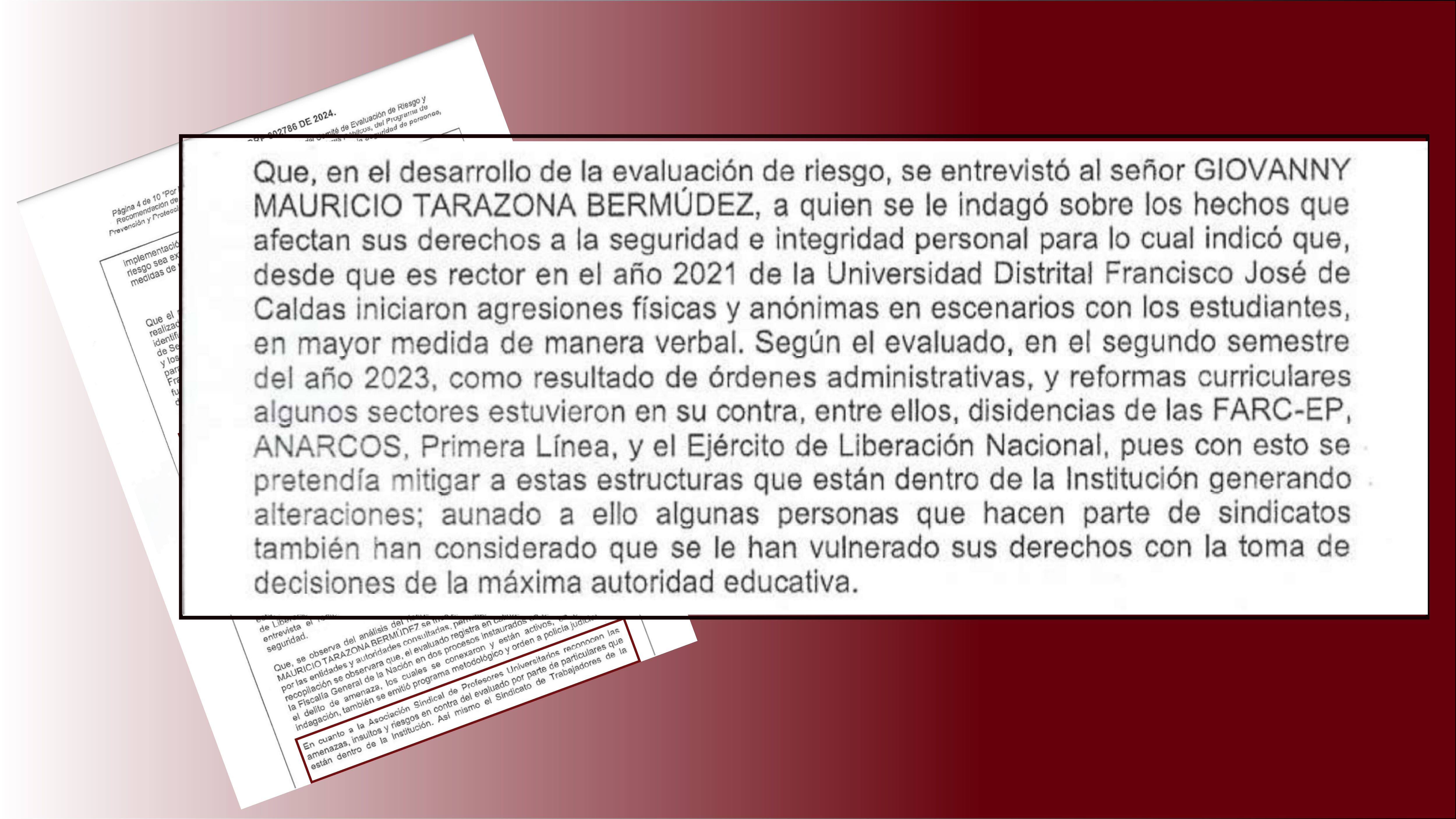 Dice el documento que, “según el evaluado (el rector), en el segundo semestre de 2023, como resultado de órdenes administrativas y reformas curriculares, algunos sectores estuvieron en su contra, entre ellos, disidencias de las FARC, anarcos, Primera Línea y el ELN, pues con estos se pretendía mitigar a estas estructuras que están dentro de la institución generando alteraciones”. (ver documento)