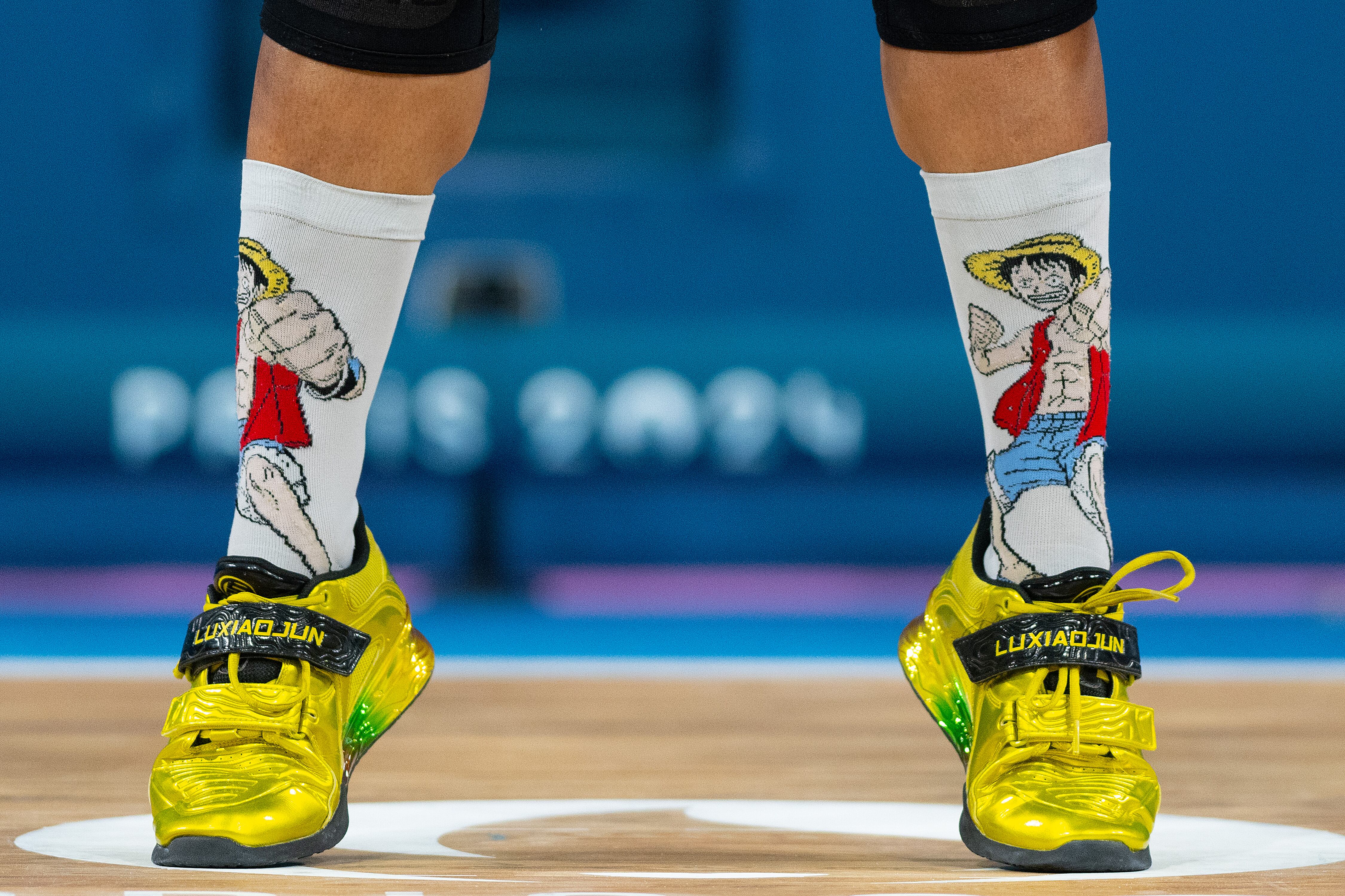 PARIS, FRANCE - AUGUST 09: A detail of Monkey D. Luffy socks of Mari Leivis Sanchez of Team Colombia as she performs a snatch during the Weightlifting Men's 89kg on day fourteen of the Olympic Games Paris 2024 at South Paris Arena on August 09, 2024 in Paris, France. (Photo by David Ramos/Getty Images) / David Ramos