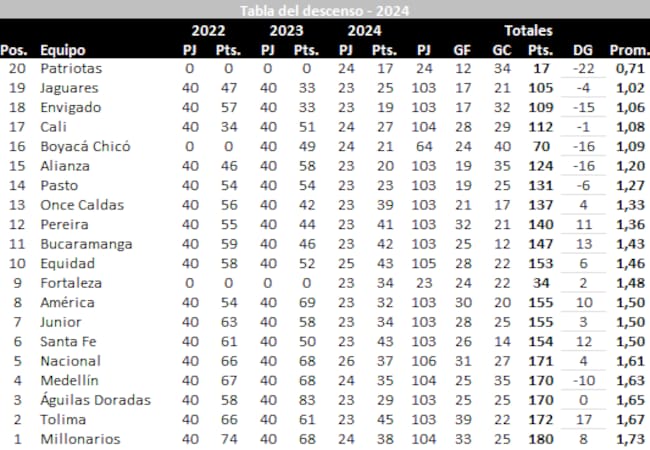 Patriotas y Fortaleza fueron los equipos promovidos a primera división para la temporada 2024. A todos los clubes, el promedio se les calculará según el puntaje logrado con relación a los partidos jugados a lo largo de los últimos tres años, salvo al equipo boyacense y al bogotano, a los cuales solo se les toma el 2024.