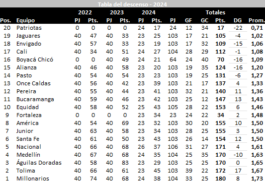 El puesto 19 y 20 son los perjudicados en la tabla del descenso, los que bajarían de categoría de cara al 2025, donde se conocerán los dos equipos que vayan a jugar el torneo colombiano.