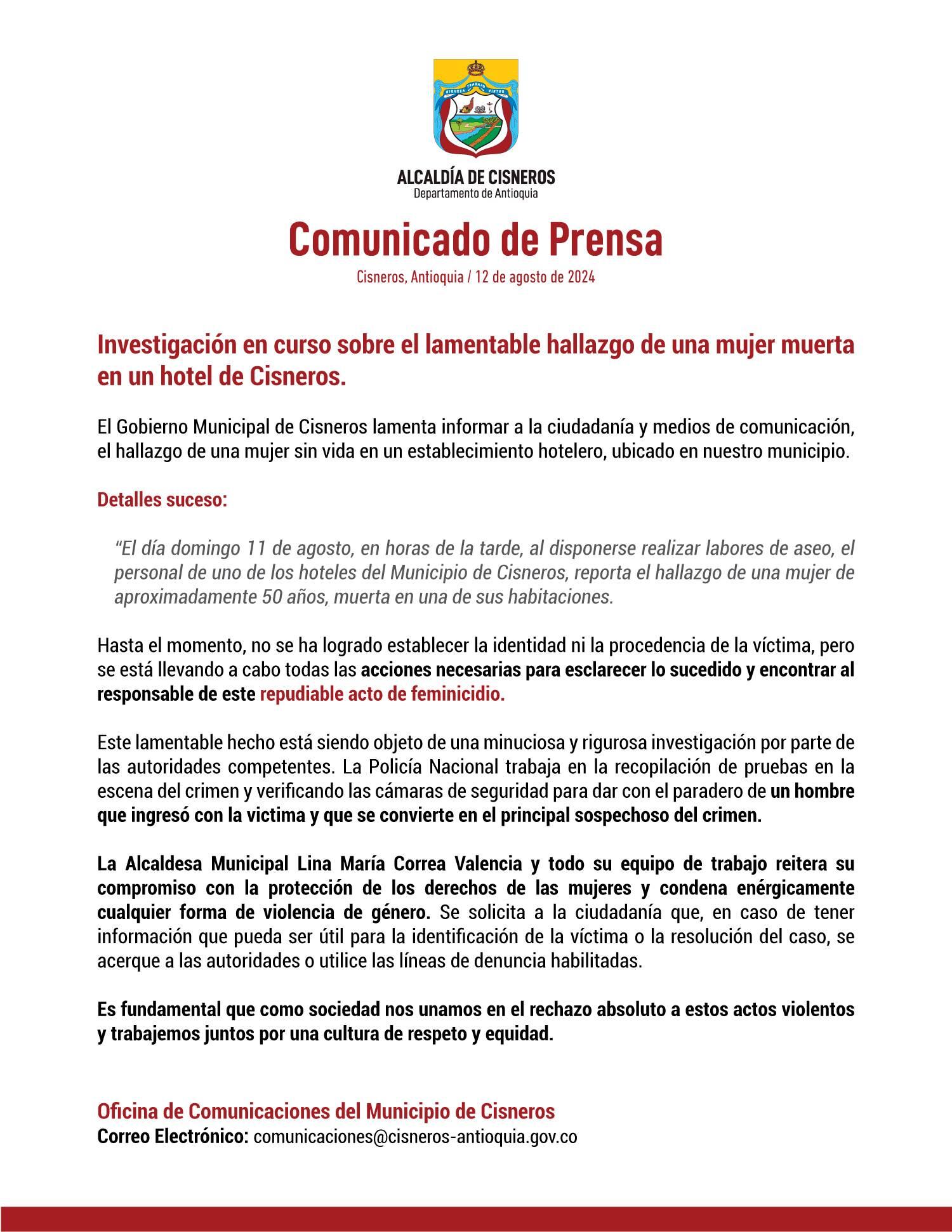 La alcaldía del municipio de Cisneros en el Nordeste de Antioquia trata de esclarecer la muerte de una mujer de 50 años dentro de la habitación de un hotel ubicado en el área urbana de esa población.