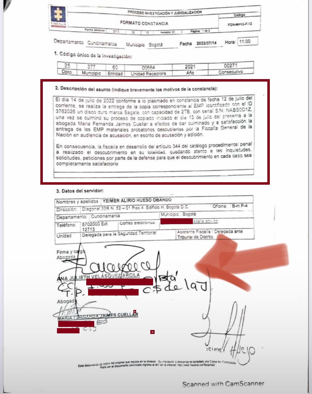 De acuerdo con la Fiscalía, en junio de 2022, el despacho del fiscal Mario Burgos hizo el traslado de la totalidad de las pruebas, y la defensa de Jhonier Leal certificó en ese momento que estaba satisfecha con el traslado de pruebas. Así quedó constancia en esta acta. Quien firma es la abogada Ana Julieth Velásquez, la misma que hoy denuncia que no conocía el video, presuntamente hallado en el celular de Mauricio Leal ((VER DOCUMENTO))