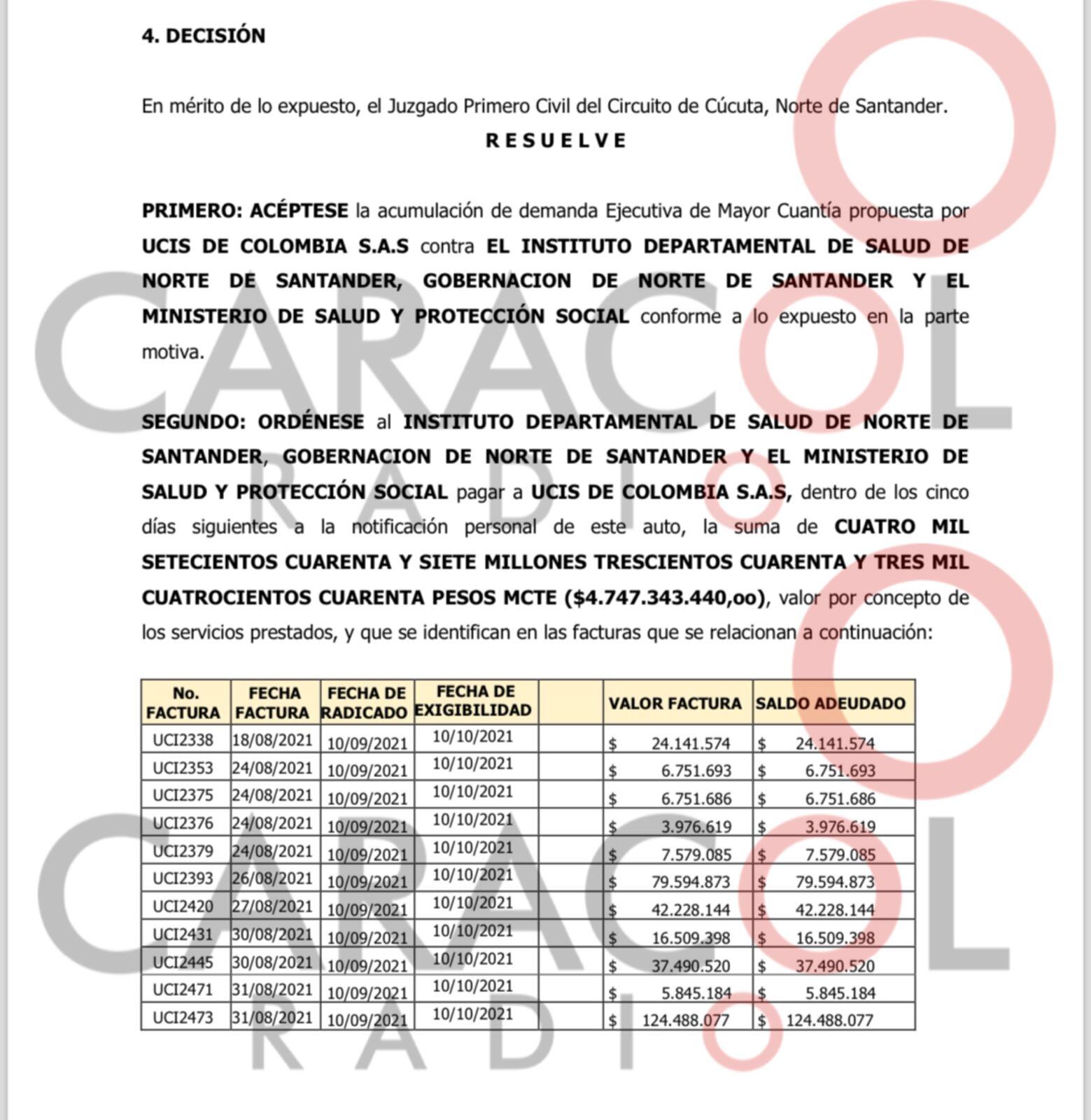 UCIS de Colombia sería el principal demandante por servicios prestados desde el año 2021 y que supera los cuatro mil setecientos millones de pesos.