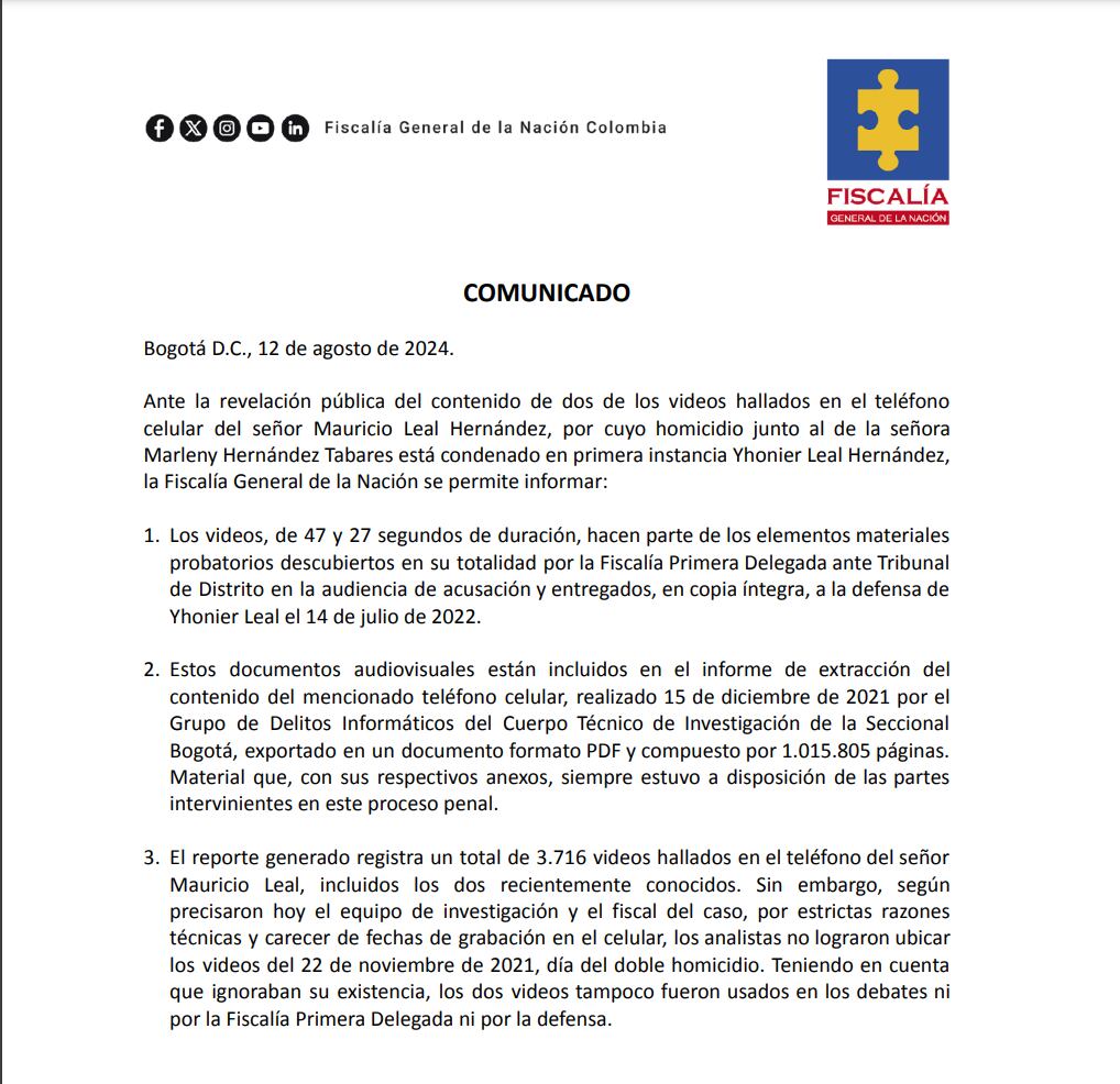Comunicado de la Fiscalía sobre el caso Jhonier Leal