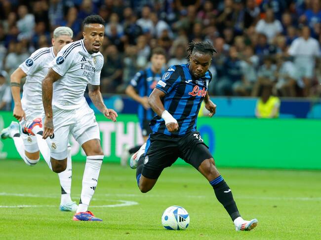 VARSOVIA, 14/08/2024.- El defensa brasileño del Real Madrid Eder Militao (i) pelea un balón con el delantero nigeriano del Atalanta Ademola Lookman durante la Supercopa de Europa de fútbol, entre el Real Madrid y el Atalanta, este miércoles en el Estadio Nacional de Polonia, en Varsovia.EFE/ Mariscal / Mariscal (EFE)