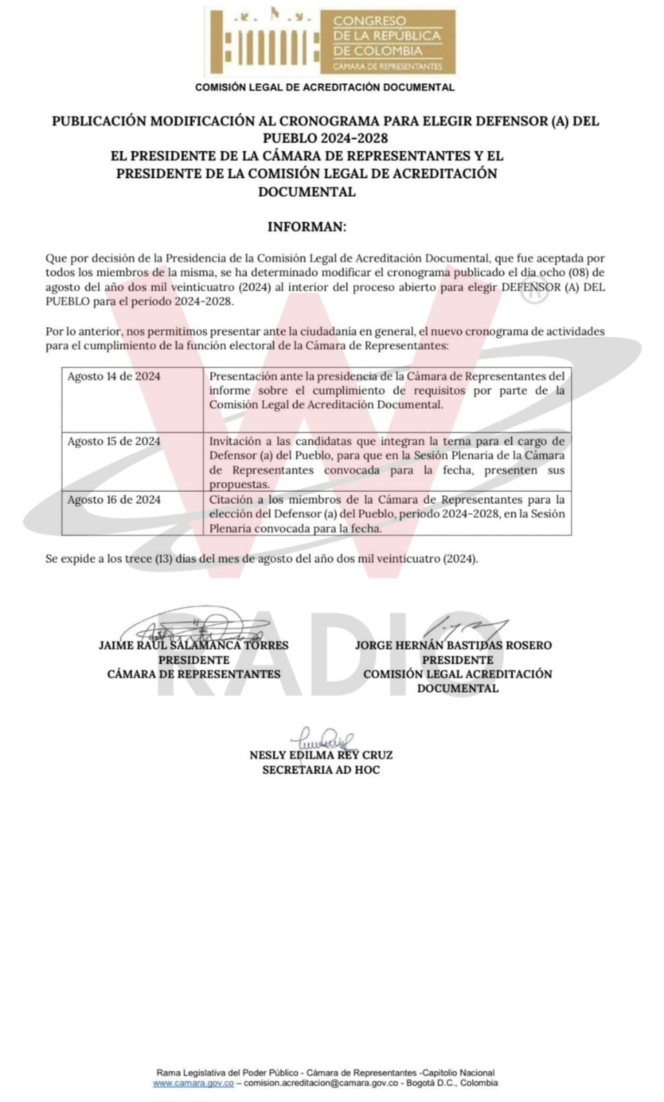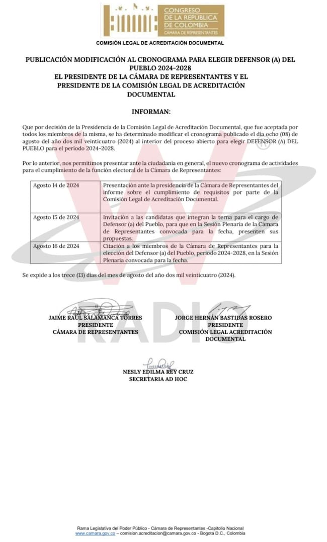 Por tal razón la fecha señalada para ese elección es la de este viernes 16. Para cumplir con el plazo la Cámara de Representantes había establecido un estricto cronograma que determinaba que hoy las aspirantes deberían hacer una presentación ante la plenaria de la corporación y el viernes debía surtirse la elección.