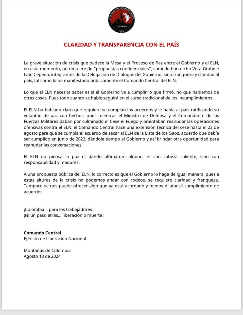 Insisten en que ellos no han puesto ningún ultimátum al proceso de paz y que la fecha del 23 de agosto para sacarlos de la lista de Grupos Armados Organizados, acuerdo que debía ser cumplido en junio de 2023, se pidió ante el anuncio del ministro de Defensa, Iván Velásquez y las Fuerzas Militares de retomar las operaciones ofensivas contra el ELN, ya que no está vigente un cese al fuego.