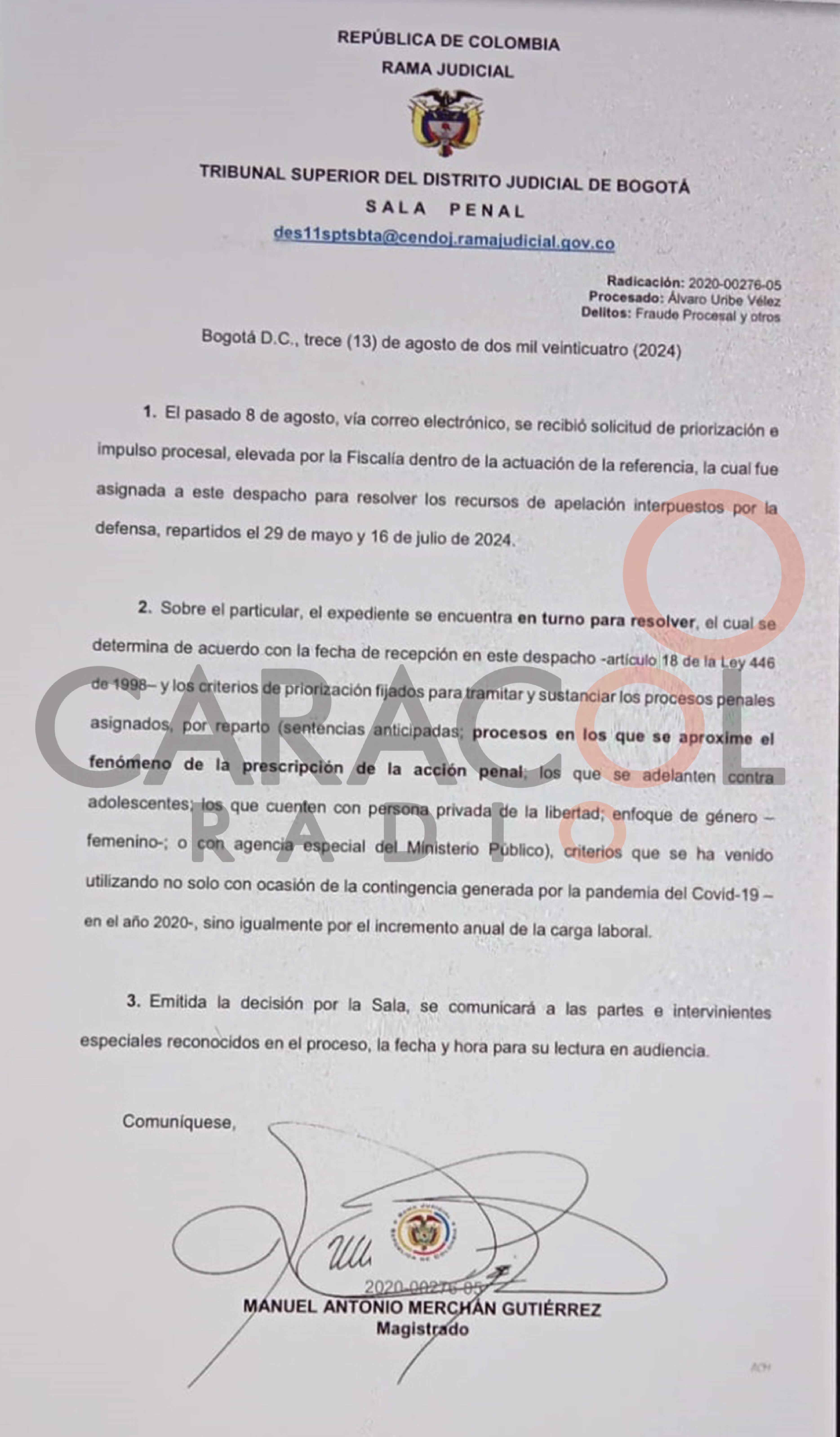 Caracol Radio conoció la repuesta del Tribunal Superior. Dice que el recurso de apelación del caso Uribe ya “se encuentra en turno para resolver”, pues hay una norma (ART 18 de la ley 446 de 1998) que permite priorizar los procesos en los que se aproxime el fenómeno de la prescripción de la acción penal (como lo es el caso Uribe). ((VER DOCUMENTO))