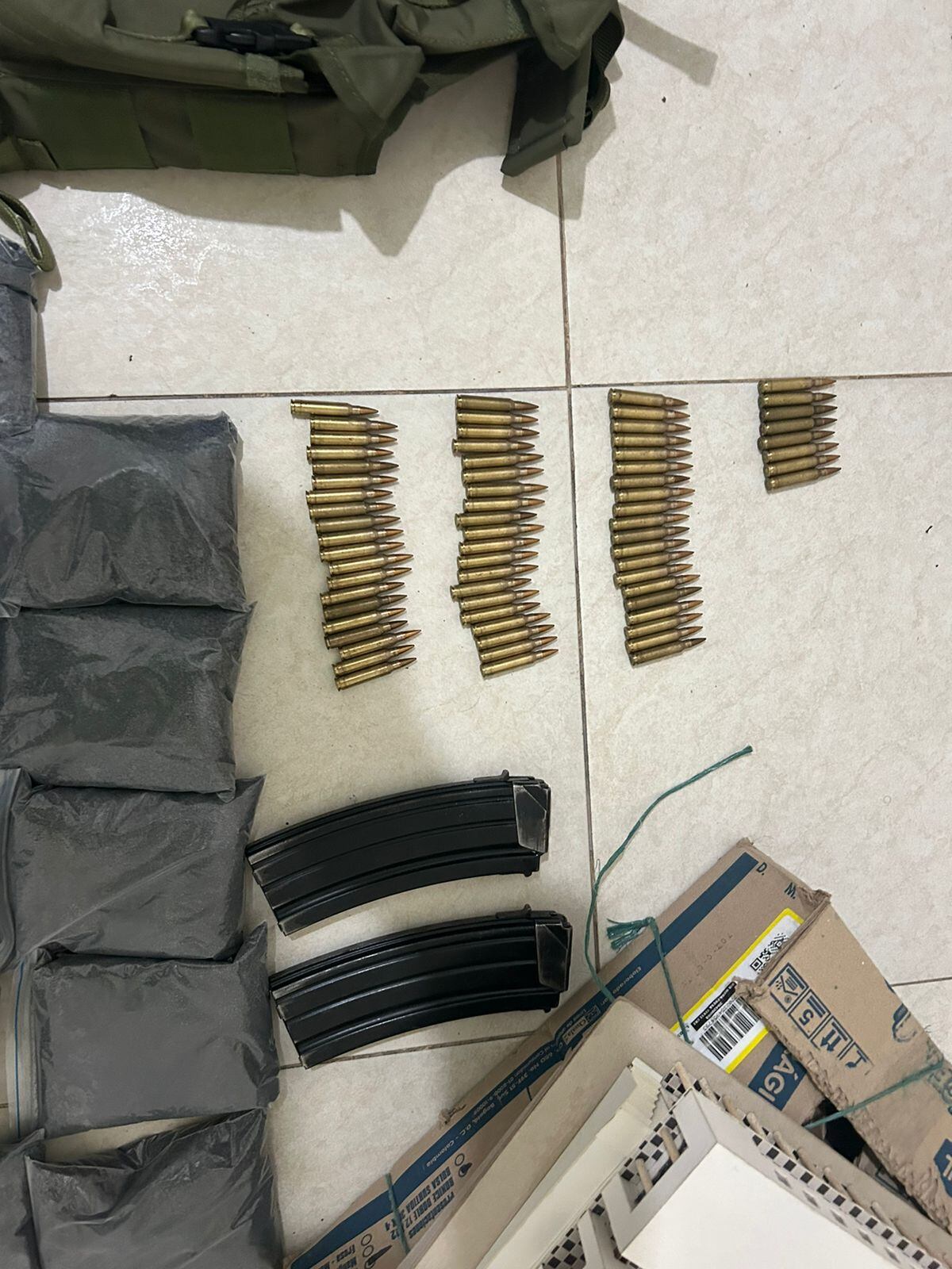 Caracol Radio también conoció parte del informe de Policía Judicial. En las imágenes queda en evidencia el hallazgo de “68 cartuchos calibre 5.56 aproximadamente; 16 paquetes de explosivo pólvora negra aluminio y nitrato de potasio r1; Un chaleco arnés uso exclusivo fuerzas militares; 2 proveedores 5.56; y la mayor preocupación de las autoridades, fue hallada una maqueta del Palacio de Justicia”.