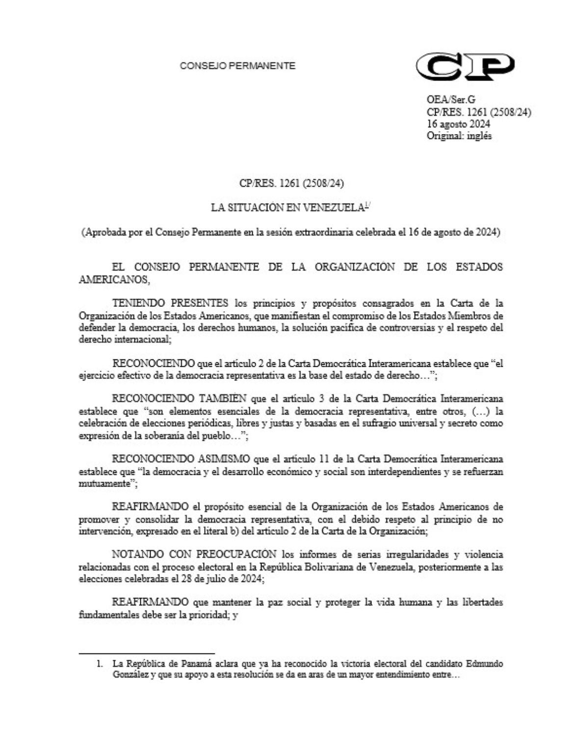 El Consejo Permanente de la OEA aprobó por consenso la resolución sobre Venezuela que pide al Consejo Nacional Electoral publicar las actas “de manera expedita” y una verificación imparcial de resultados de las elecciones presidenciales del pasado 28 de julio.