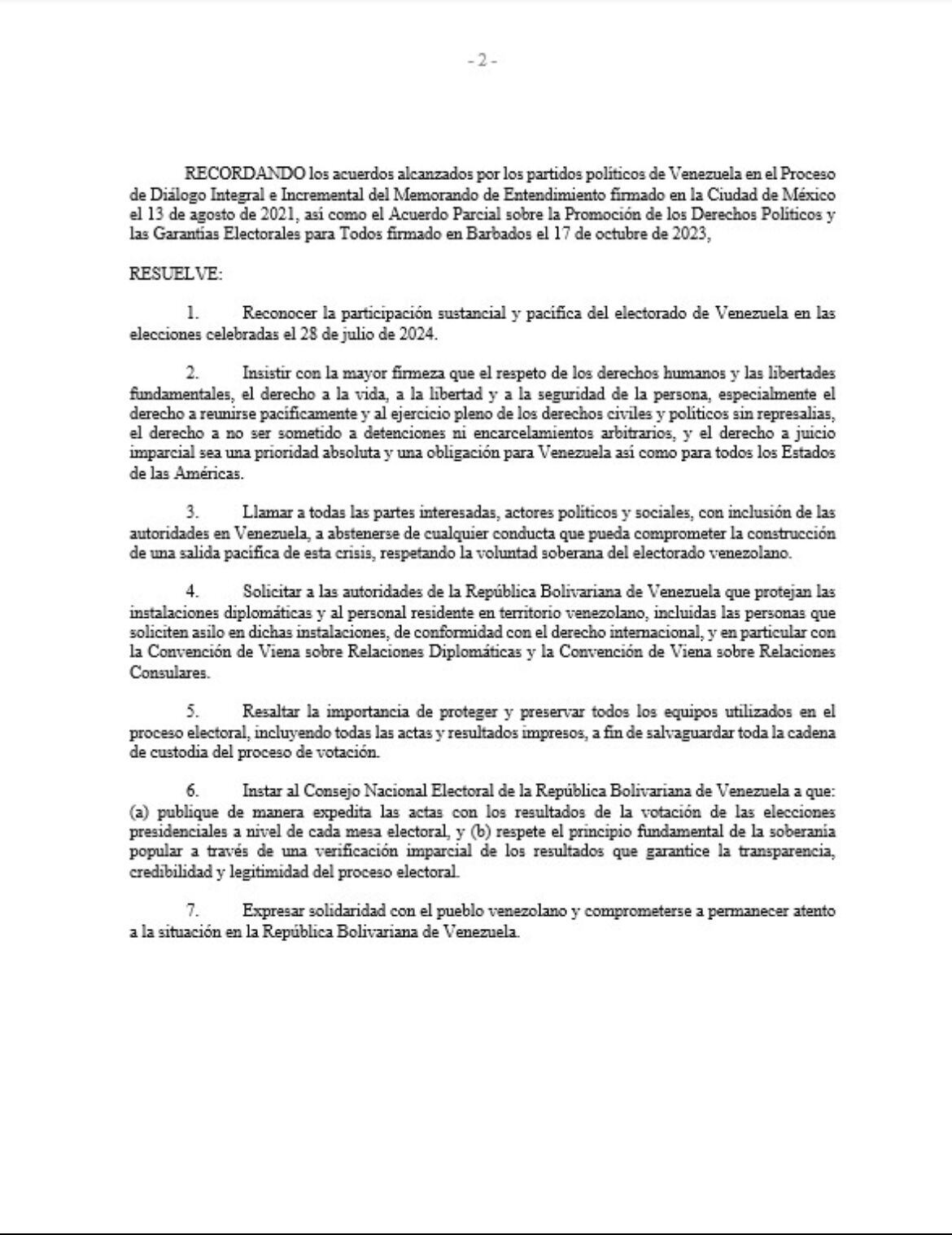 La resolución insta al Consejo Nacional Electoral (CNE) de Venezuela a quepublique de manera expedita las actas con los resultados de la votación de las elecciones presidenciales a nivel de cada mesa electoral” y “respete el principio fundamental de la soberanía popular a través de una verificación imparcial de los resultados que garantice la transparencia, credibilidad y legitimidad del proceso electoral”.