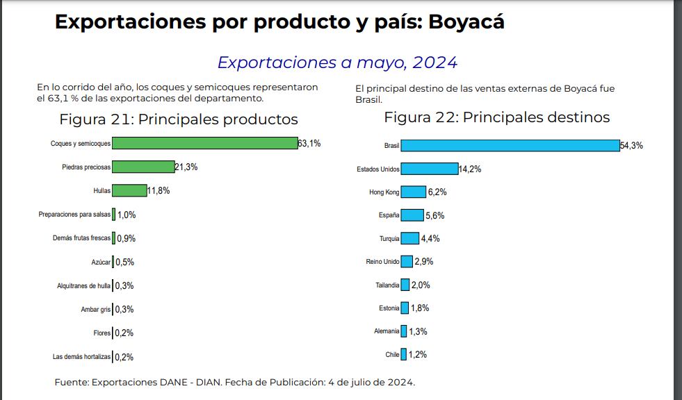 Al respecto, el director de Investigación de la Escuela Superior de Administración Pública, Jacinto Pineda, explicó en Caracol Radio: “Boyacá, dentro de su estructura económica, se caracteriza por ser un departamento con bajas exportaciones, porque representan en el total nacional el 1,37 %, jalonadas principalmente por carbón y piedras preciosas; el 99 % de las exportaciones dependen de estos productos. En Boyacá, los coques y semicoques representan el 63,1 % y las hullas el 11,8 %, y el 21,3 % son las piedras preciosas (las esmeraldas). Nuestras principales exportaciones no son principalmente minero energéticas y están concentradas en Brasil, Estados Unidos y Hong Kong”.