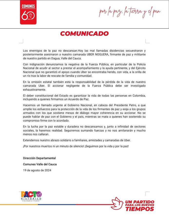 El comunicado del partido señala: “Las mal llamadas disidencias secuestraron y posteriormente asesinaron a nuestro camarada Uber Noguera. Con indignación, denunciamos la negativa de la fuerza pública, en particular de la Policía, de acudir al sector para prestar acompañamiento y ayuda pertinente. Además, el Ejército no garantizó apoyo cuando Uber se encontraba herido y con vida a la orilla del río, tras la labor de rescate de la familia y la comunidad”.