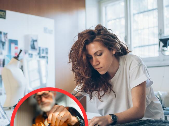 Mujer trabajando y hombre con alcancía dorada (Getty Images)