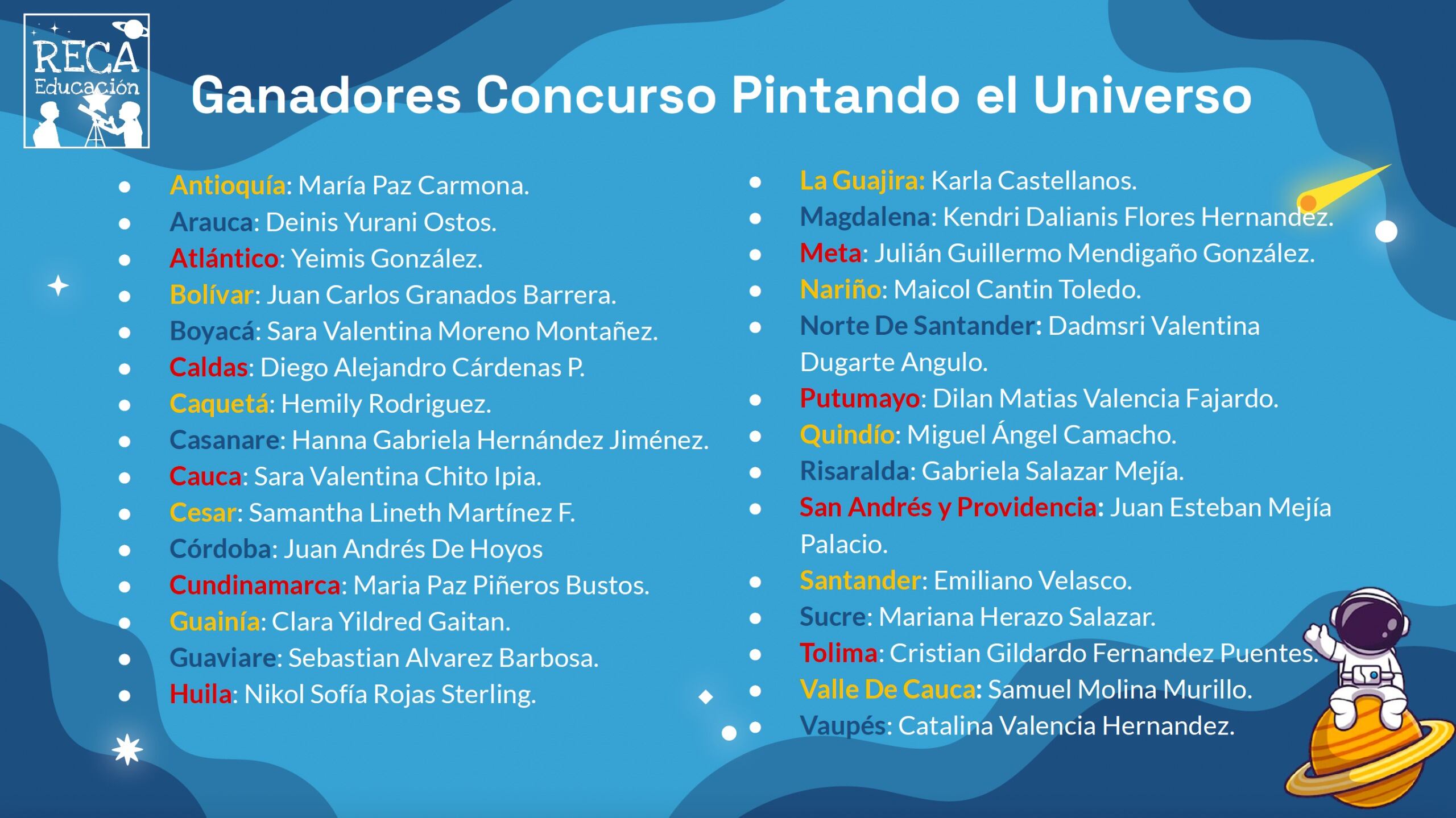 El concurso, organizado por la Red de Estudiantes de Astronomía de Colombia, retó a niños de todo el país a plasmar en un dibujo la relación entre la astronomía y la identidad colombiana. La propuesta no fue sencilla, pero los resultados superaron las expectativas. “Inicialmente, uno podría pensar que es difícil encontrar la conexión entre astronomía e identidad colombiana, pero los niños nos sorprendieron con sus ideas. De inmediato comenzaron a imaginar el mar, el atardecer, el sol y la noche, y sus ideas fueron realmente enriquecedoras”, explicó la profesora Rocío Roa Romero, quien asumió con entusiasmo la responsabilidad de guiar a los niños en este proceso creativo.