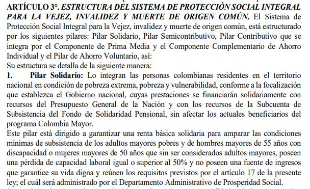 Todos los colombianos que hayan vivido al menos los últimos 10 años en el país, que se encuentren en situación de pobreza y vulnerabilidad, y que no cuenten con pensión alguna serán beneficiarios de este pilar: