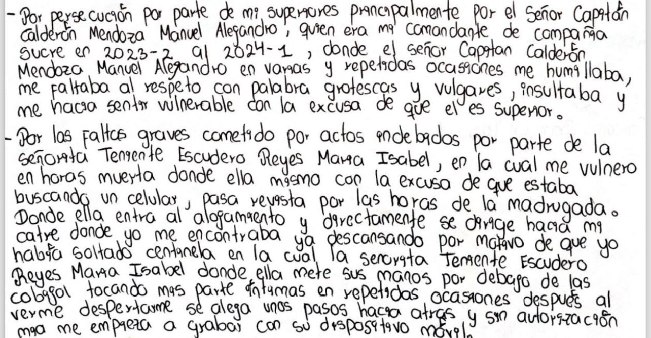 En la carta de solicitud de baja, también conocida por este medio, la cadete acusó al capitán Calderón Mendoza Manuel Alejandro, quien fue su comandante en la campaña Sucre durante el periodo 2023-2024, de humillarla repetidamente con palabras vulgares y de hacerla sentir vulnerable, utilizando su rango superior como justificación.