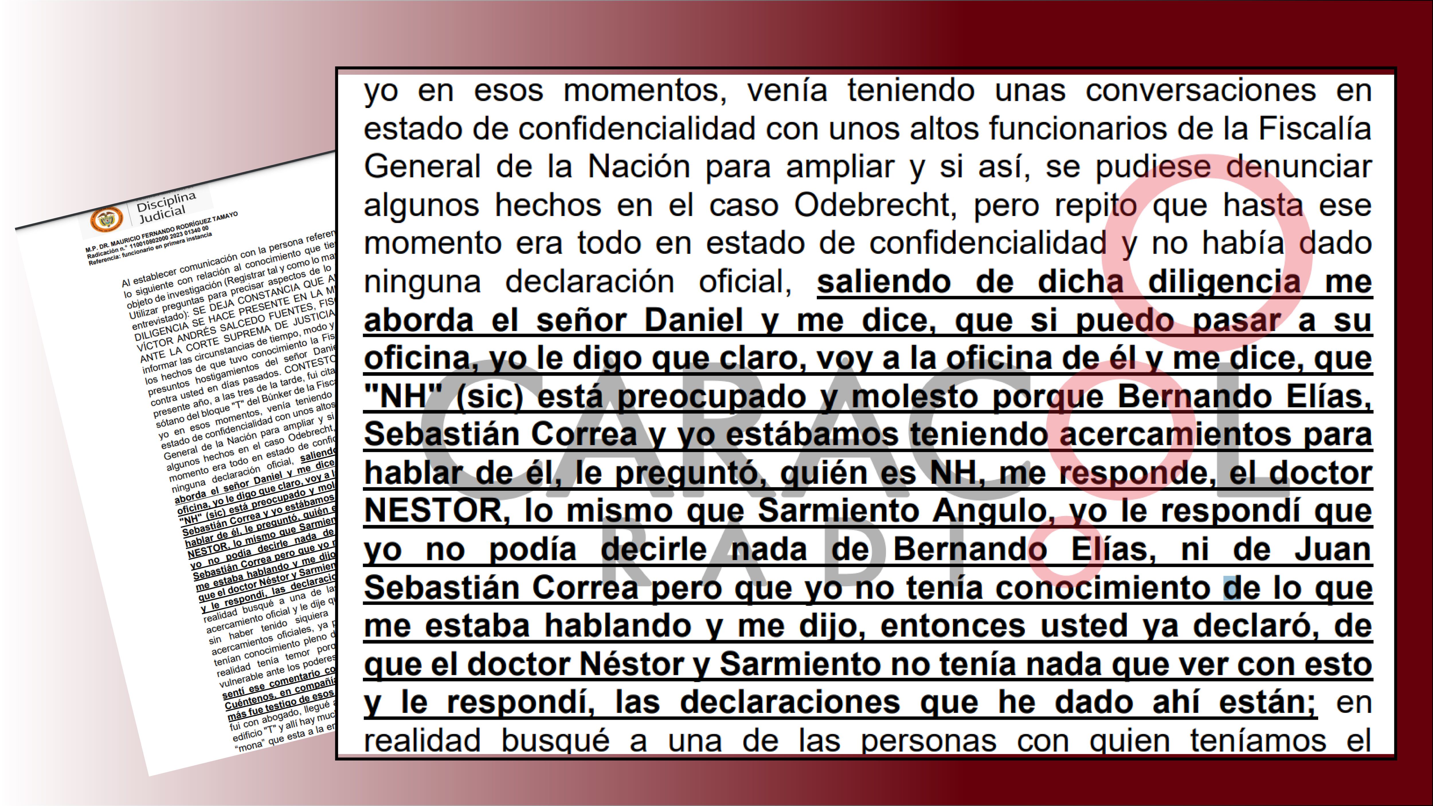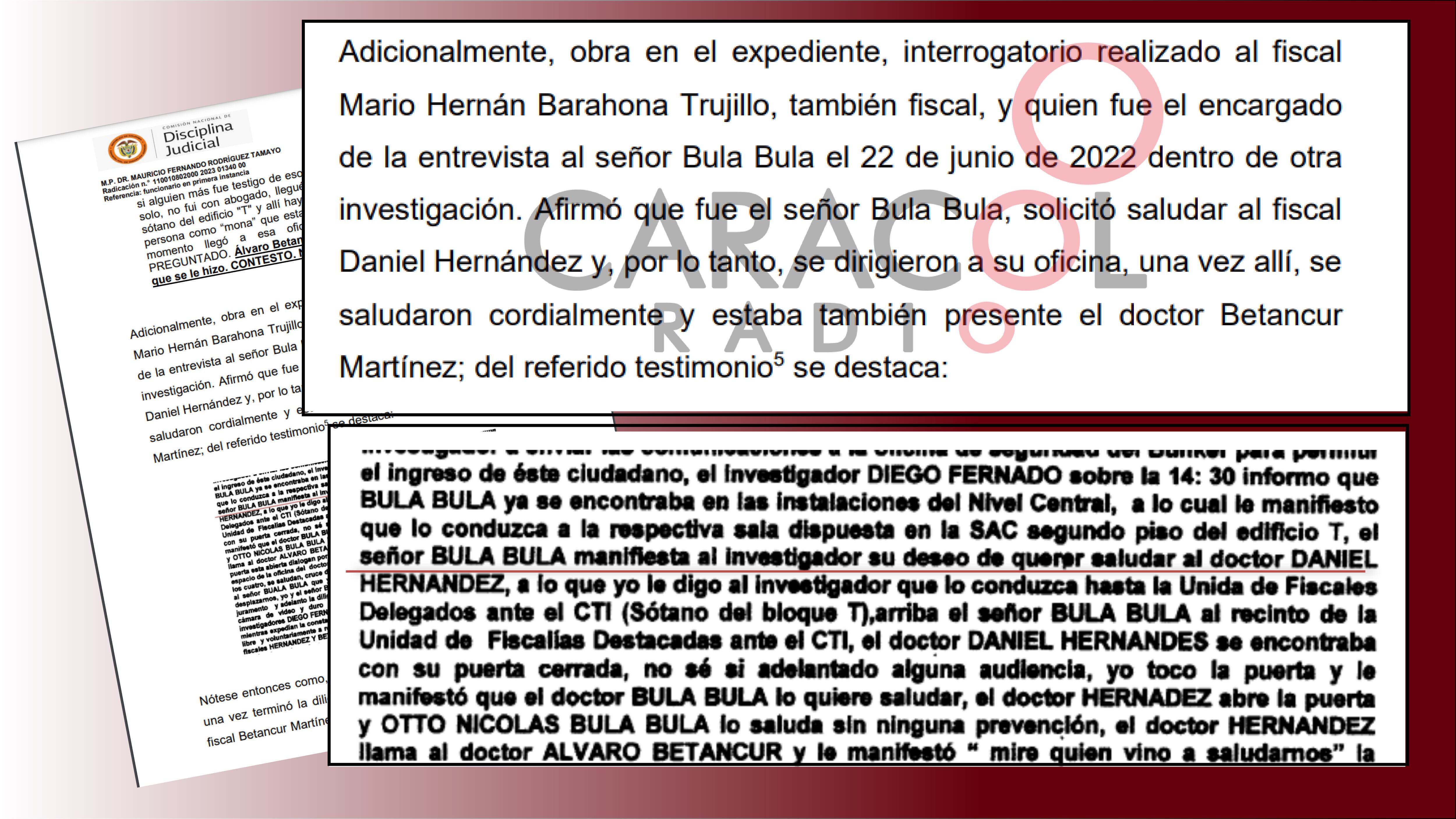 Pero, el fiscal Barahona, describió una situación completamente distinta, afirmó que fue el señor Otto Bula fue quien solicitó saludar al fiscal Hernández. ((ver documento))