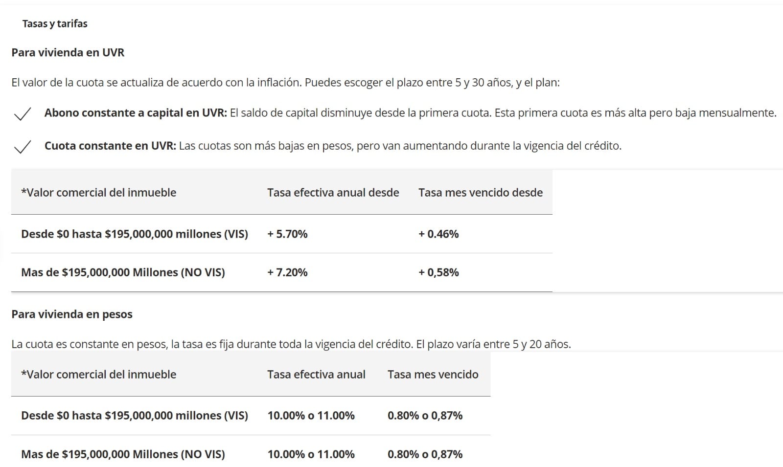 En caso de que se desee el compromiso de la vivienda en pesos, según Bancolombia, se puede adquirir una deuda con “una cuota que es constante en pesos, la tasa es fija durante toda la vigencia del crédito. El plazo varía entre 5 y 20 años.”