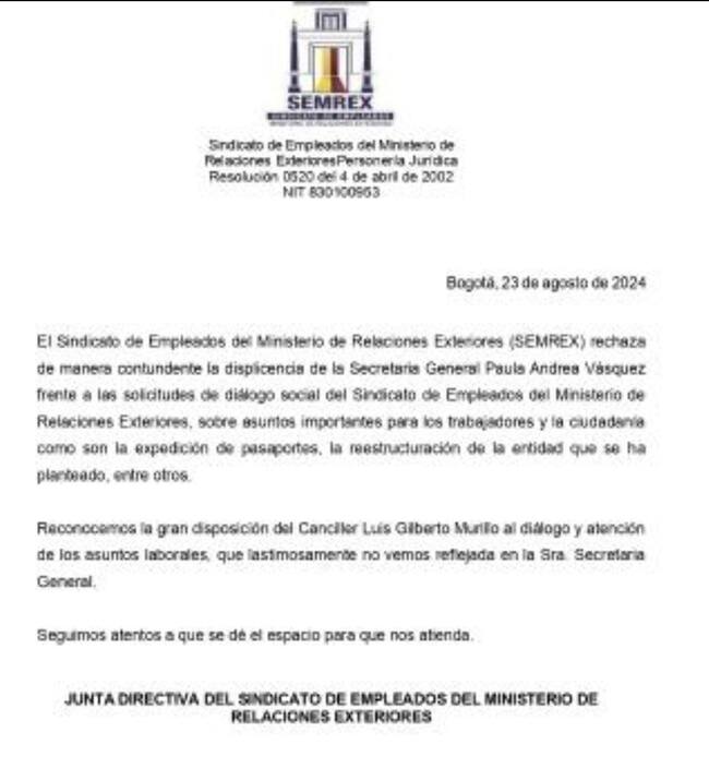 Las quejas por malos tratos por parte de la secretaria aumentan al punto en que conocimos una carta del 23 de agosto, por parte del sindicato del Ministerio de Relaciones Exteriores, donde expresan: “el sindicato rechaza de manera contundente la displicencia de la secretaria general, Paula Andrea Vásquez, frente a las solicitudes de diálogo social sobre asuntos importantes para los trabajadores”.