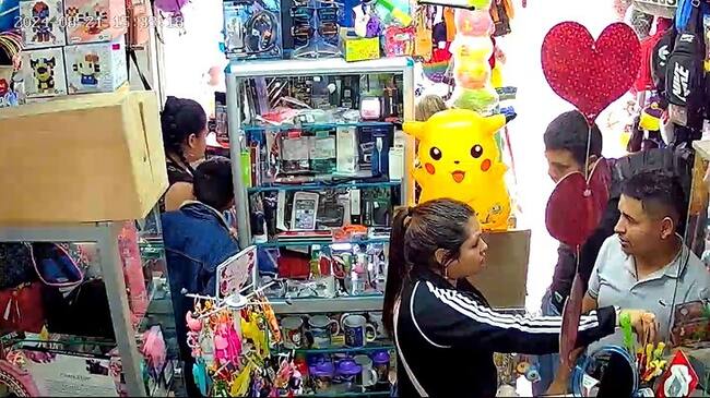 En cámaras de seguridad ubicadas en el barrio San Carlos ubicado en la localidad de Tunjuelito, donde se puede ver a una mujer distrayendo a la vendedora mientras que otras cuatro personas que ingresan con ella, entre ellos un menor de edad, hurtan diversos productos.