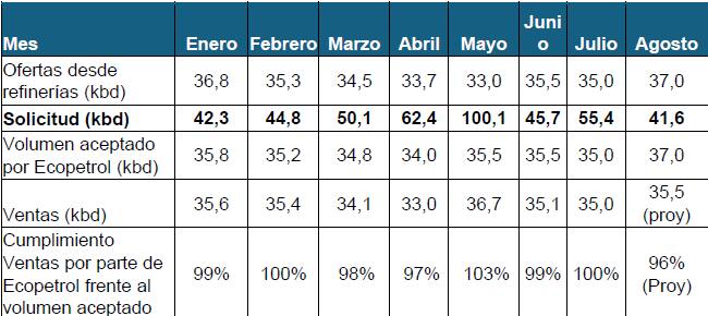 En los meses precedentes las ofertas por parte de Ecopetrol y las solicitudes de los distribuidores mayoristas fueron las siguientes: