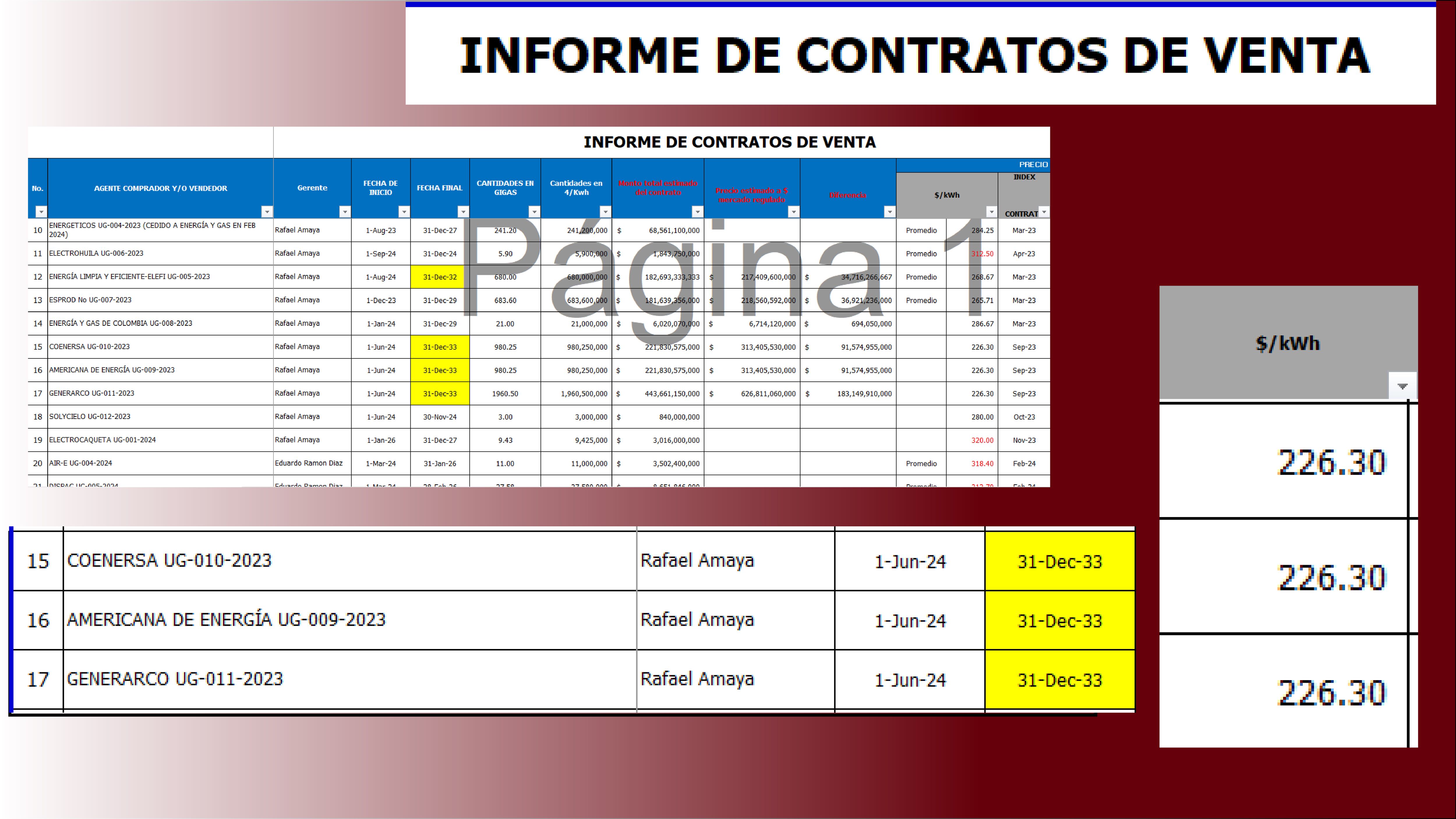 COENDERSA, AMERICANA DE ENERGÍA Y GENERARCO, se firmaron contratos cuya venta de energía comprometió hasta el 31 de diciembre del año 2033