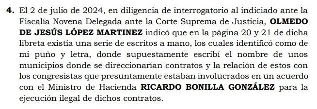 El abogado Moreno, también señaló que “para entender el contexto de la declaración de Olmedo López debemos conocer no solamente la declaración filtrada malintencionadamente a los medios de comunicación, en donde el señor Olmedo López hace esas afirmaciones, sino también la declaración realizada el 15 de julio del 2024, en donde el señor Olmedo López amplía y aporta más elementos, otra libreta, y afirma que la página 21 fue escrita por la representante a la Cámara, Karen Manrique, y la página 20 no fue escrita por ella”, dijo.