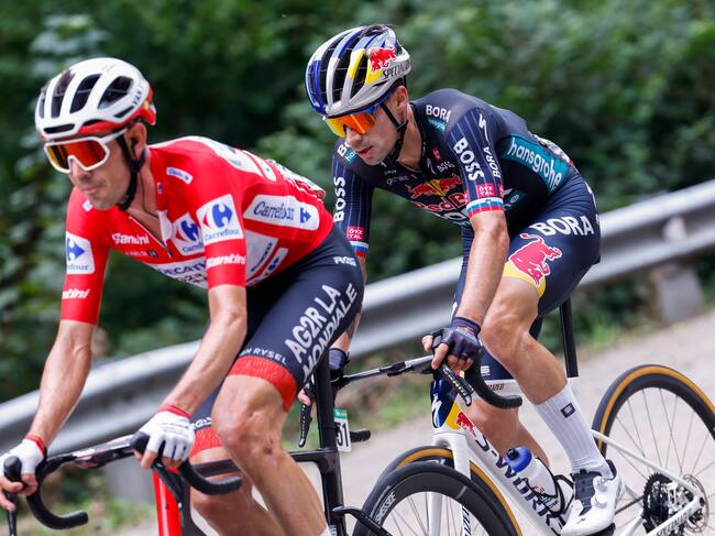 CUITU NEGRU (ASTURIAS), 01/09/2024.- El ciclista australiano del Decathlon y líder de la clasificación general, Ben O'Connor (i) y el esloveno del Red Bull Bora Primoz Roglic durante la decimoquinta etapa de la Vuelta ciclista a España disputada este domingo entre Infiesto y Cuitu Negru, con 143 kilómetros de recorrido. EFE/Javier Lizón / Javier Lizon (EFE)